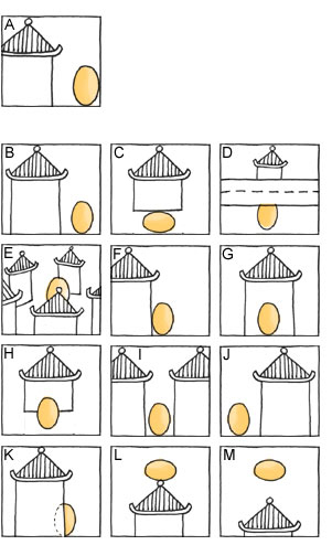 Where is the object in relation to the house(s)? Match the pictures to the prepositions.