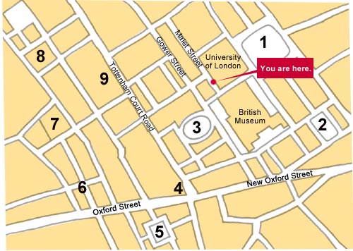 Listen to three conversations in which people ask for directions. The conversations take place at the Malet Street entrance to the University of London. For each conversation, select the correct destination.